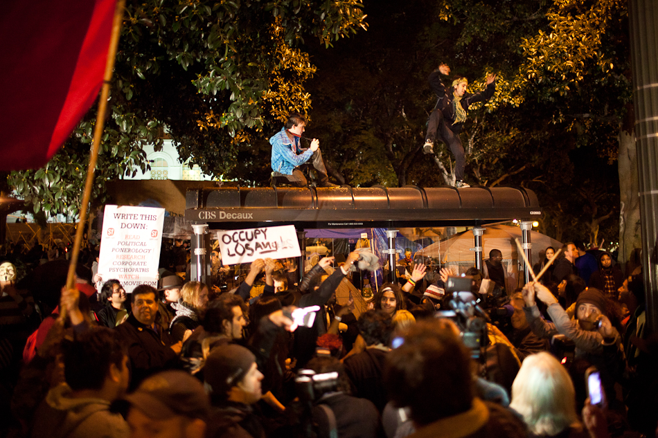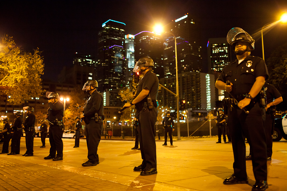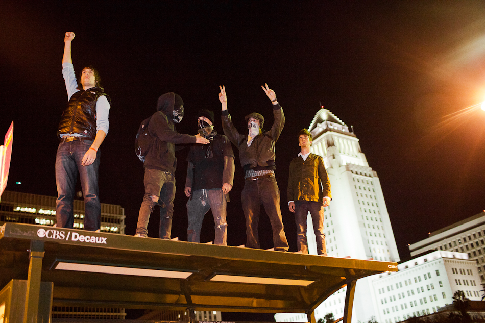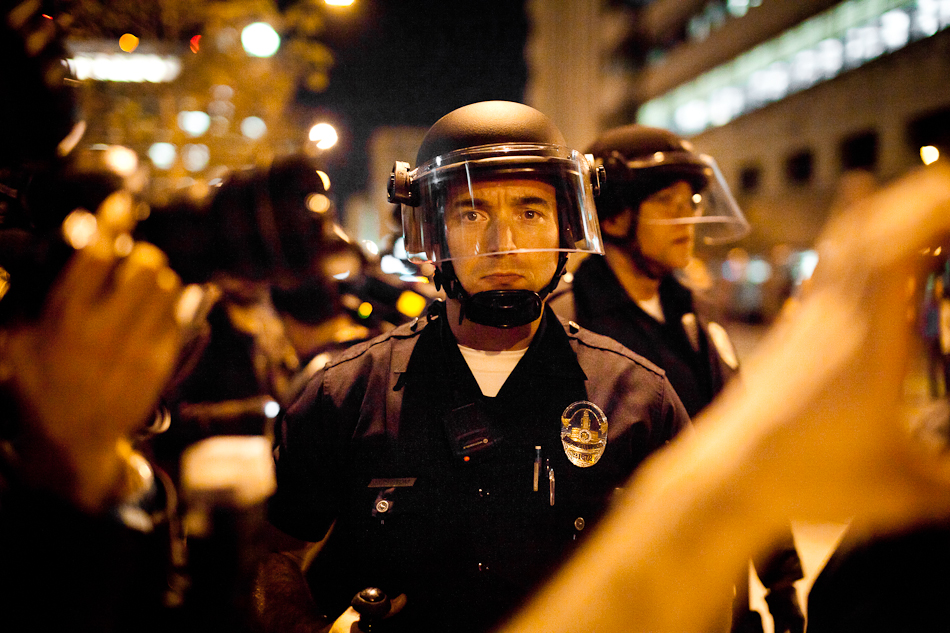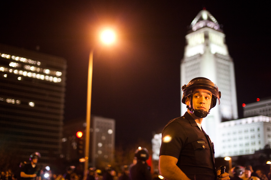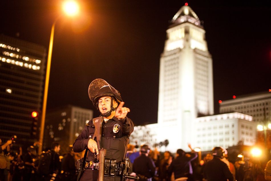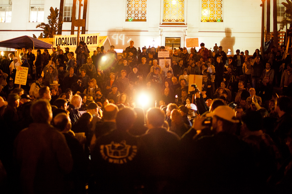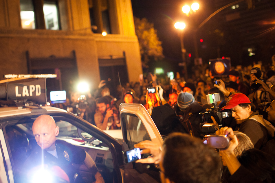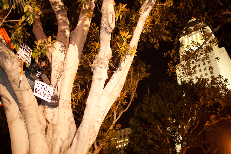 I went down to City Hall last Monday to visit the LA occupy camp set up there. It was the night that the mayor’s eviction notice was supposed to take effect and the couple hundred people staying in the park would need to pack up and go. Although aimed at clearing the park, the eviction notice gathered in hundred of people filling the park around city hall and ultimately flooding out into the street. The LAPD did indeed show up, in quite large numbers, and I have to say I was quite impressed with how both side handled the whole situation. Neither side was provoking or overstepping bound on what ended up being a pretty tense situation. The violence and disruption that has affected other factions of the OWS movement seemed somewhat anticipated but the police held to their promise that they were there to maintain safety. They even thanked people for protesting over their loudspeaker. It’s kind of a weird situation photographing these kind of things because although you don’t want to see people get hurt, a part of you anticipates and wants action and drama to be able to shoot it. I even had my wrong gear facemask with me in case of any tear gas or pepper spray. In the end, I ended up leaving around 200am because i was starving and had to go occupy my kitchen.